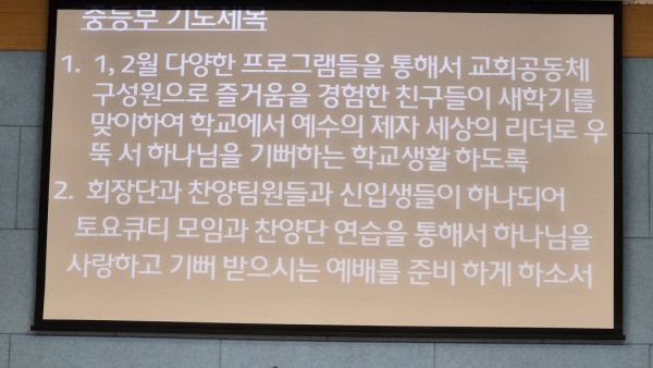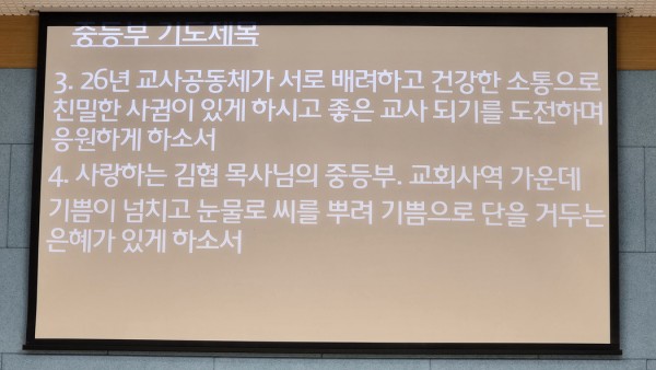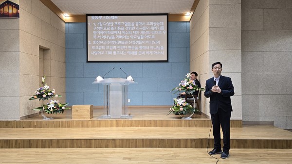 중등부 부장 김의남 장로님의 중등부 기도제목 설명 모습.